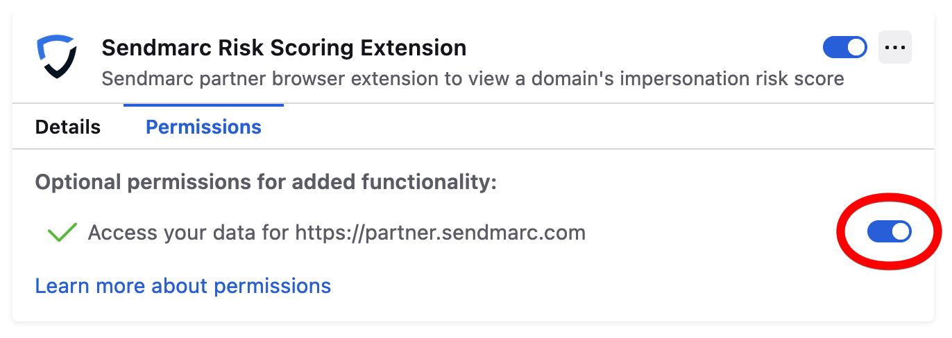 6. Haz click en "Permissions" (Permisos) y activa la opción para permitir que la extensión acceda al portal.