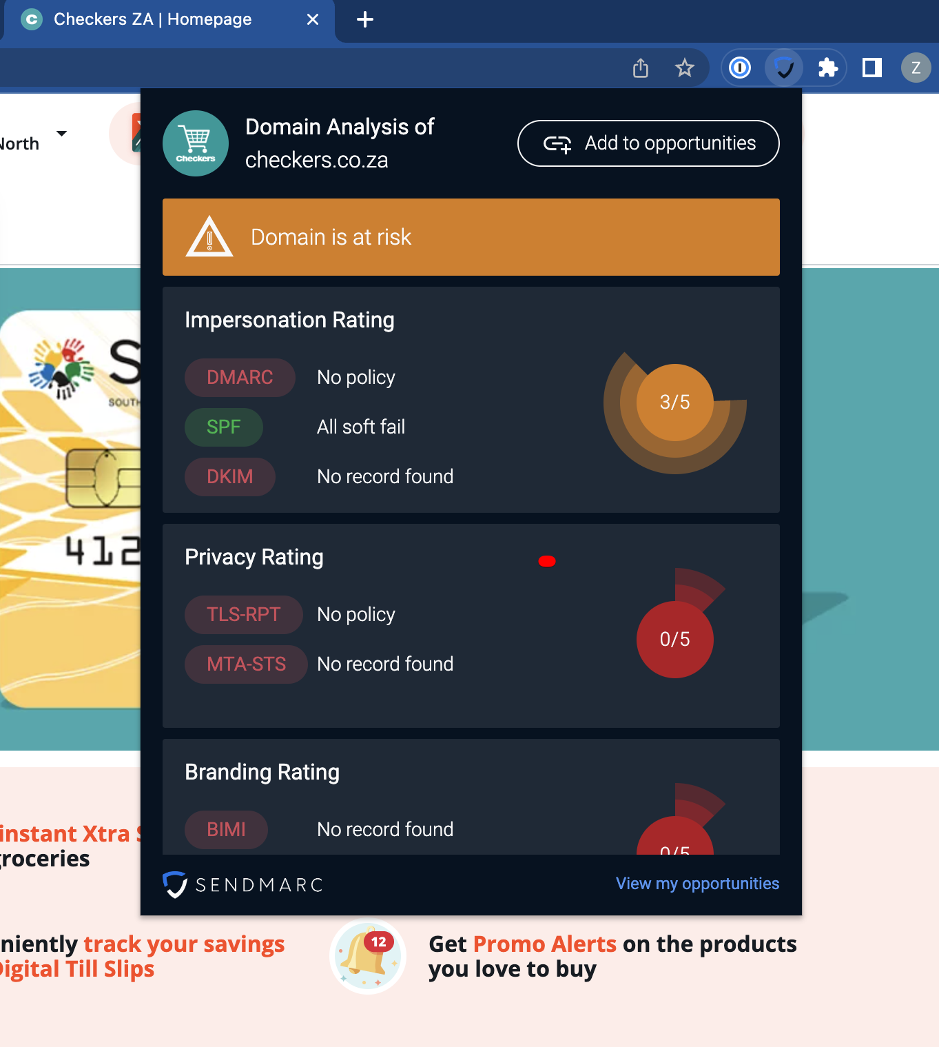 Al hacer click en el botón de la extensión Sendmarc Risk Scoring, verás de inmediato el puntaje de riesgo del sitio web que estás visitando.