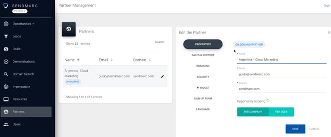 - En Properties puedes editar el nombre del socio, email y dominio.