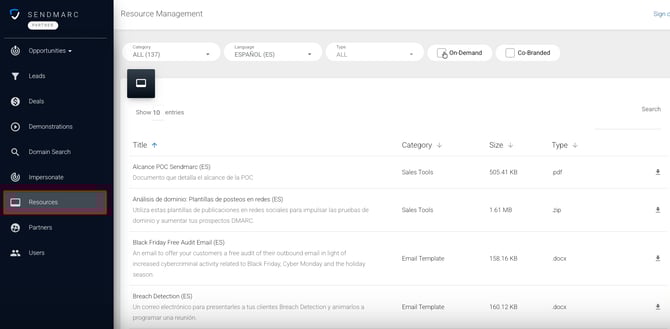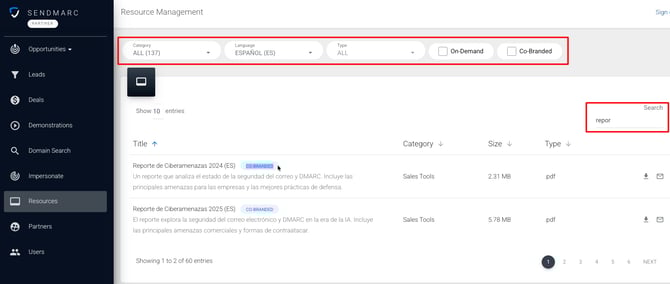 En la sección Resources podrás encontrar recursos útiles para descargar en el idioma seleccionado. Puedes encontrar desde plantillas para emails, para publicaciones en redes, así como también folletos comerciales. En la parte superior puedes utilizar los filtros y/o el campo de búsqueda para mayor facilidad: