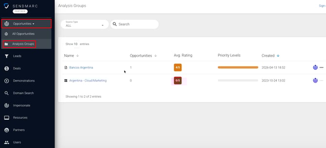 - En la sección Opportunities / Analysis Groups puedes generar reportes para tus grupos de dominios.