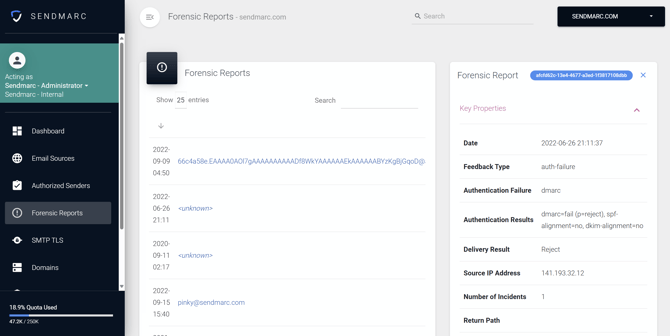 The Failure Reports Dashboard will show you information about any failure reports that have been received and have been configured to come to Sendmarc.