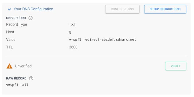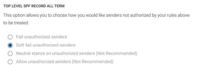 Understand the various settings available for your SPF record, these settings will only take affect if DNS delegation has been implemented and verified. Follow the setup instructions above.